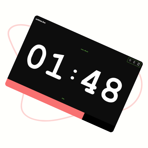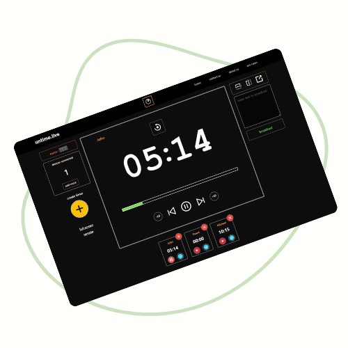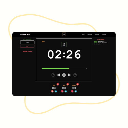 Experience the timer in its simplest form. Full-screen mode shows only the essentials—timer, name, and room code. With no controls, View Mode is perfect for audiences or displays needing clarity, focus, and distraction-free time tracking.